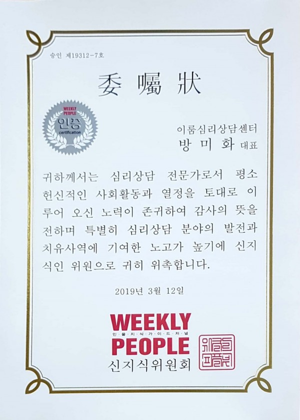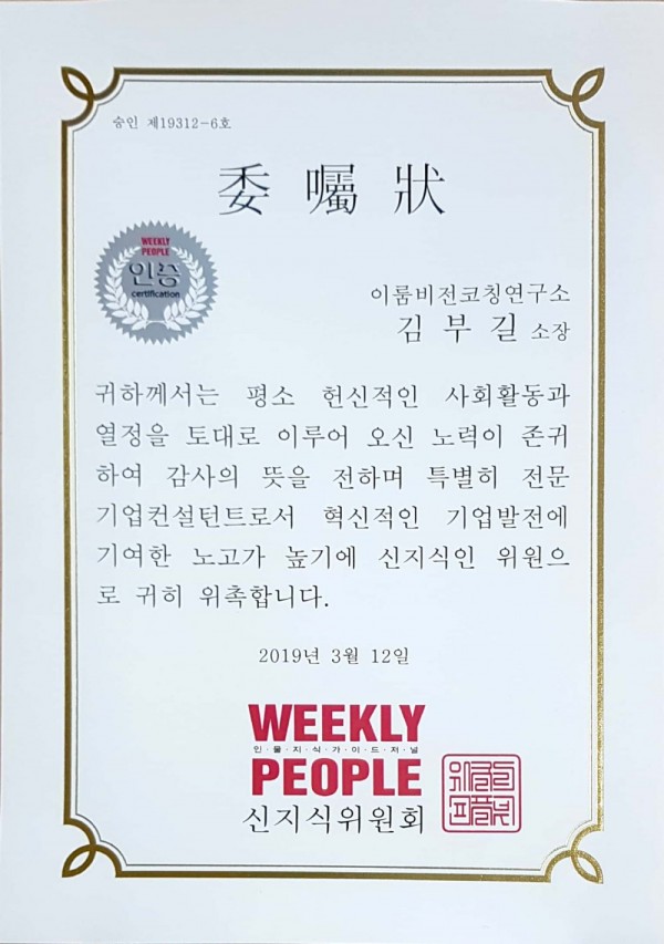 위클리피플지 신지식인 위원에 위촉되었습니다.