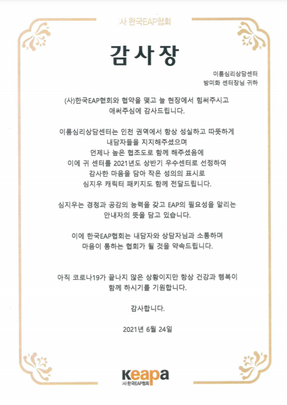 2021년 6월 24일에 (사)한국EAP협회로부터 감사장을 받았습니다.