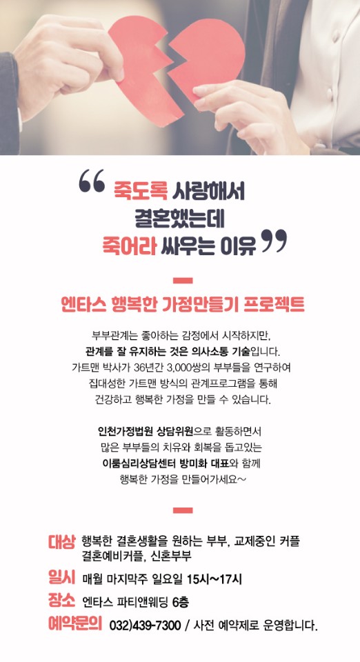 엔타스파티앤웨딩과 이룸심리상담센터가 함께 * 장소 : 엔타스 파티앤웨딩(인천1호선. 예술회관역 근처) * 신청 및 문의 : 이룸심리상담센터(010-6339-1957), 엔타스 파티앤웨딩(032-439-7300) |