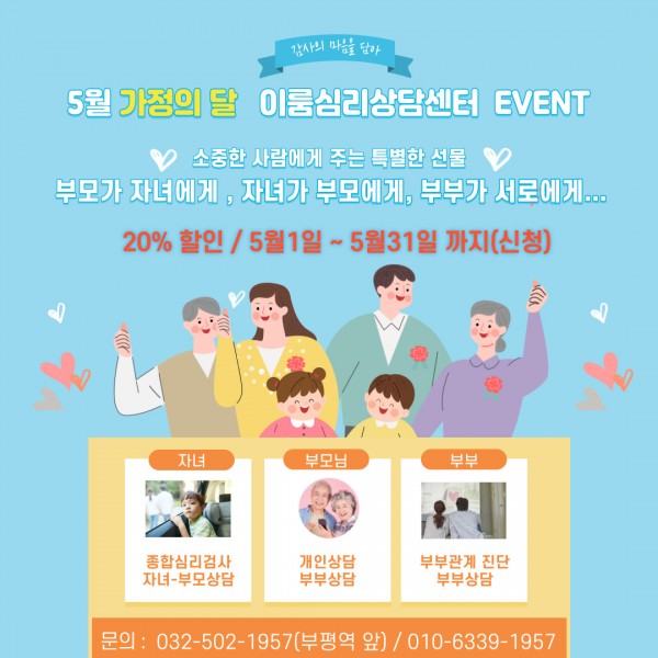 ♥ 5월 가정의 달 상담 EVENT ♥ 가정의 달을 맞아 ‘소중한 가족에게 무엇을 선물할까’ 고민하고 계신가요? 올해는 특별한 선물을 해보시면 어떨까요? ✅ 소중한 내 아이의 마음건강을 '종합심리검사'로 살펴주고, 자녀-부모상담을 ✅ 진로문제로 고민하는 자녀에게 '진로상담'을 ✅ 고마운 부모님에게는 오래오래 행복하시도록 ‘개인상담이나 부부상담’을 ✅ 더 나은 부부관계를 위해 ‘부부관계 진단과 부부상담’을 추천합니다. ♦신청기간: 2021년. 5월 1일 ~ 5월 31일 (5월 말까지 신청한 상담의 혜택은 상담 종결 시까지 적용됩니다) ♦장소: 이룸심리상담센터(부평역 앞) ♦대상: 가족에게 특별한 선물을 하고 싶은 분 ♦혜택: 20%할인(종합심리검사, 개인/부부상담 등) ♦문의: 032-502-1957 / 010-6339-1957 |