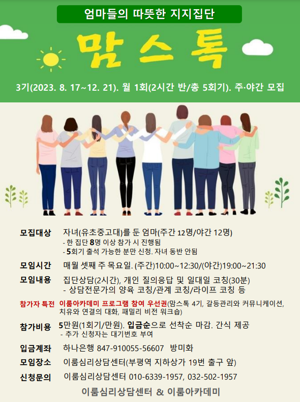 ⚫ 모집대상 : 자녀(유초중고대)를 둔 엄마(주간 12명/야간 12명) - 한 집단 8명 이상 참가 시 진행 - 5회기 출석 가능한 분만 신청. 자녀 동반 안됨 ⚫ 모임시간 : 매월 셋째 주 목요일. (주간)10:00~12:30/(야간)19:00~21:30 ⚫ 모임내용 : 집단상담(2시간), 개인 질의응답 및 일대일 코칭(30분) - 상담전문가의 양육 코칭/관계 코칭/라이프 코칭 등 ⚫ 참가자 특전 : 이룸아카데미 프로그램 참여 우선권 부여 - 맘스톡 4기, 갈등관리와 커뮤니케이션, 치유와 연결의 대화, 패밀리 비전 워크숍 ⚫ 참가비용 : 5만원(입금순으로 선착순 마감. 간식 제공. 추가 신청자는 대기번호 부여) ⚫ 입금계좌 : 하나은행 847-910055-56607 방미화 ⚫ 모임장소 : 이룸심리상담센터(부평역 지하상가 19번 출구 앞) ⚫ 신청문의 : 이룸심리상담센터 010-6339-1957, 032-502-1957
