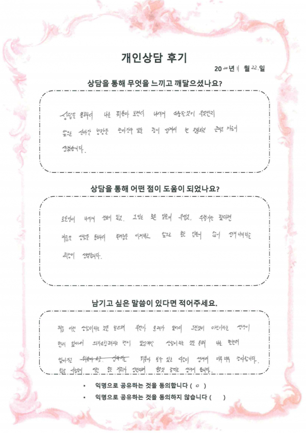 후기는 내담자(이용자)의 동의를 받고 게재 합니다.